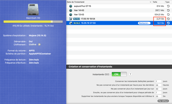 Dans Carbon Copy Cloner, il est possible d’activer ou pas la création d’instantanés (je ne sais plus quel est le choix par défaut). Je pense que ça vaut la peine de profiter de cette possibilité d’autant plus qu’il est simple de supprimer ces instantanés.