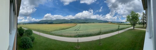 La fonction panoramique déforme la réalité mais ce que je veux dire (en l’écrivant) c’est que j’ai adoré le coup d’œil: peu de traces de l’Homme en vue. Ça me rappelle ce que je lisais sur la maison (« La Boiseerie ») du Général De Gaulle à Colombey-les-Deux-Églises: la vue portait à 30 kilomètres sans qu’on voie une trace (autre qu’agricole, je suppose) de l’activité de l’Homme.