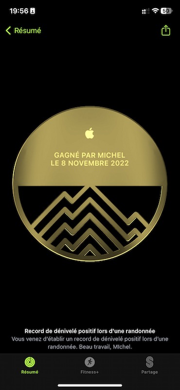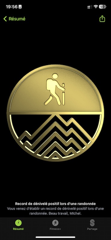 Petite surprise agréable. L’app « Forme » me gratifie d’un trophée pour avoir amélioré mon record de dénivelé positif: