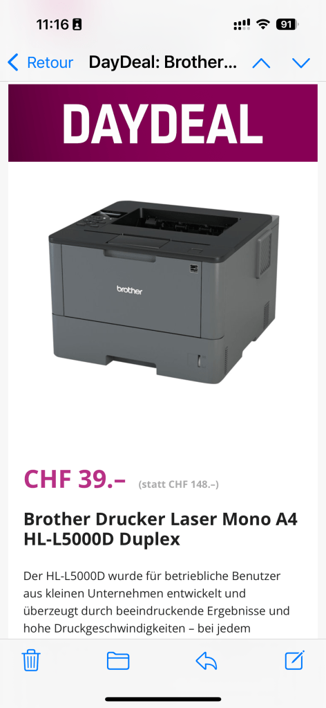 Je l’ai commandée. A 30 francs, c’est moins cher que le toner (la cartouche livrée avec permet d’imprimer 2’000 pages à 5 %). L’imprimante fait du recto-verso (pas besoin de remettre manuellement la feuille de papier dans le magasin).