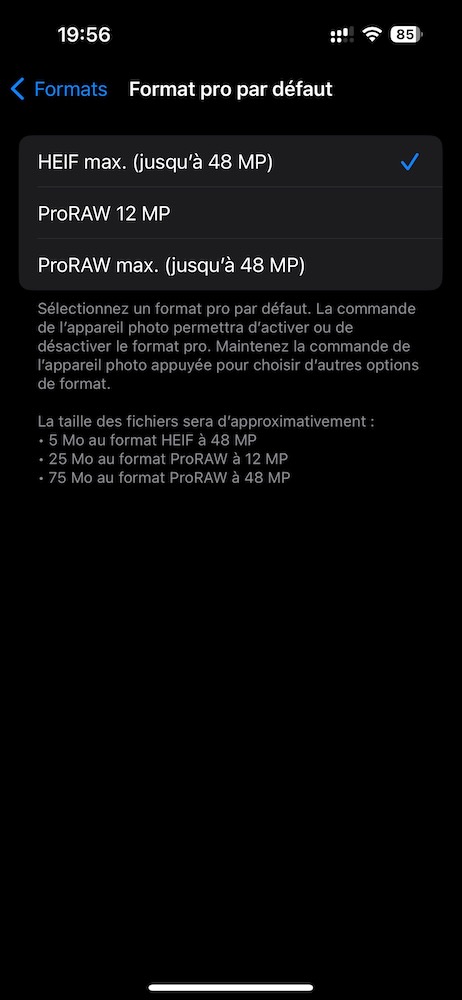 iOS 17 (m’)apporte une fonctionnalité bien pratique: l’enregistrement de photographies 48 millions de pixels non plus seulement au format RAW mais aussi en HEIF. Ceci permet d’obtenir des fichiers pesant plus de dix fois moins (curieuse manière compliquée d’écrire la chose) que les fichiers RAW (donc non compressés).