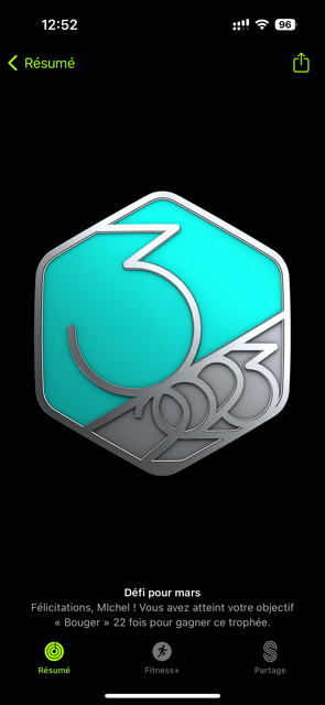 Pour l’obtenir, il a fallu compléter 22 jours (pas forcément de suite) l’anneau « Bouger ».